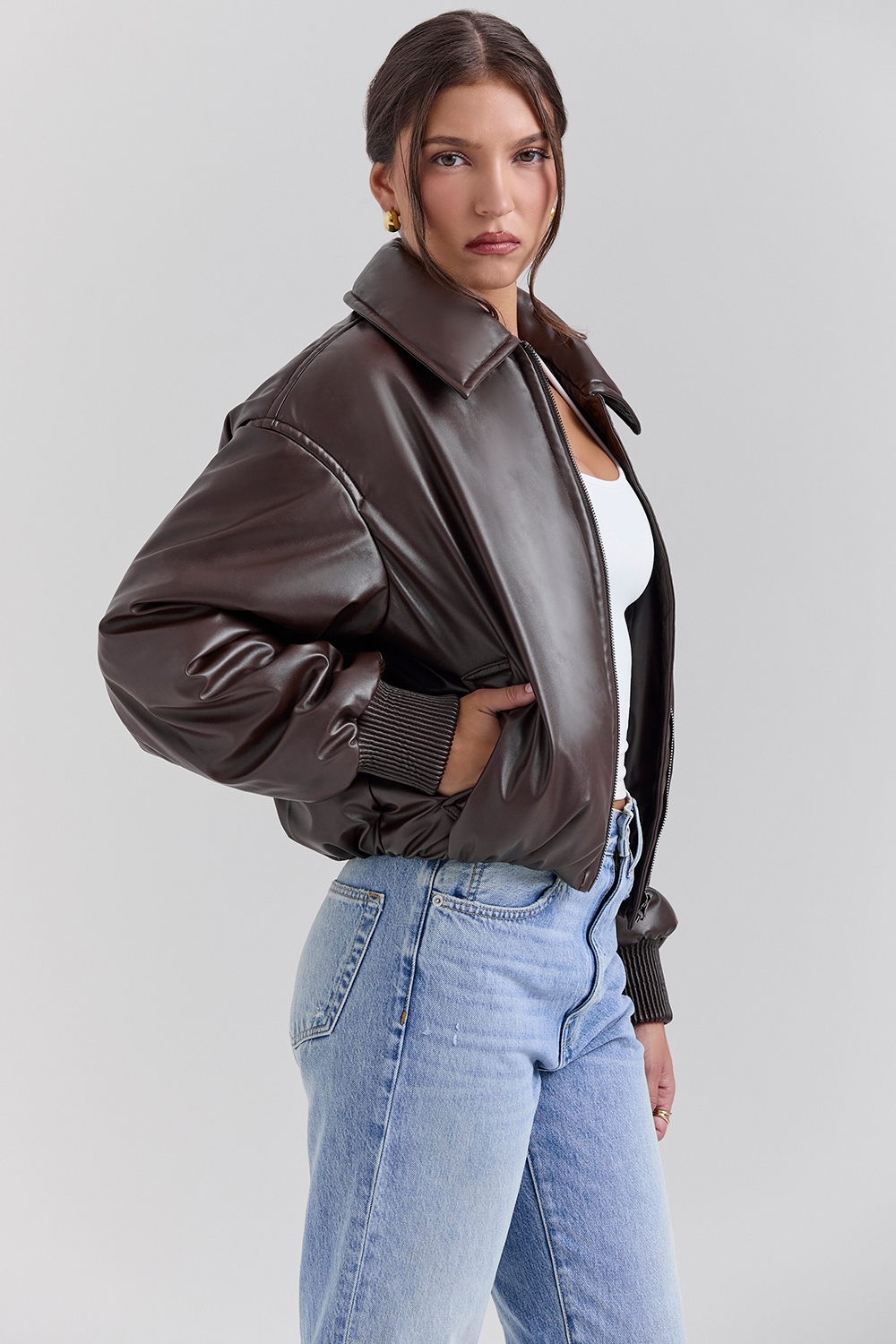 Dark Brown Vegan Leather Bomber Jacket